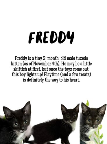Charlie is a handsome 1-year-old male and the brother of Dunker. He might not be the friendliest at first, but he does have a soft spot for treats and who can resist that? 🍪